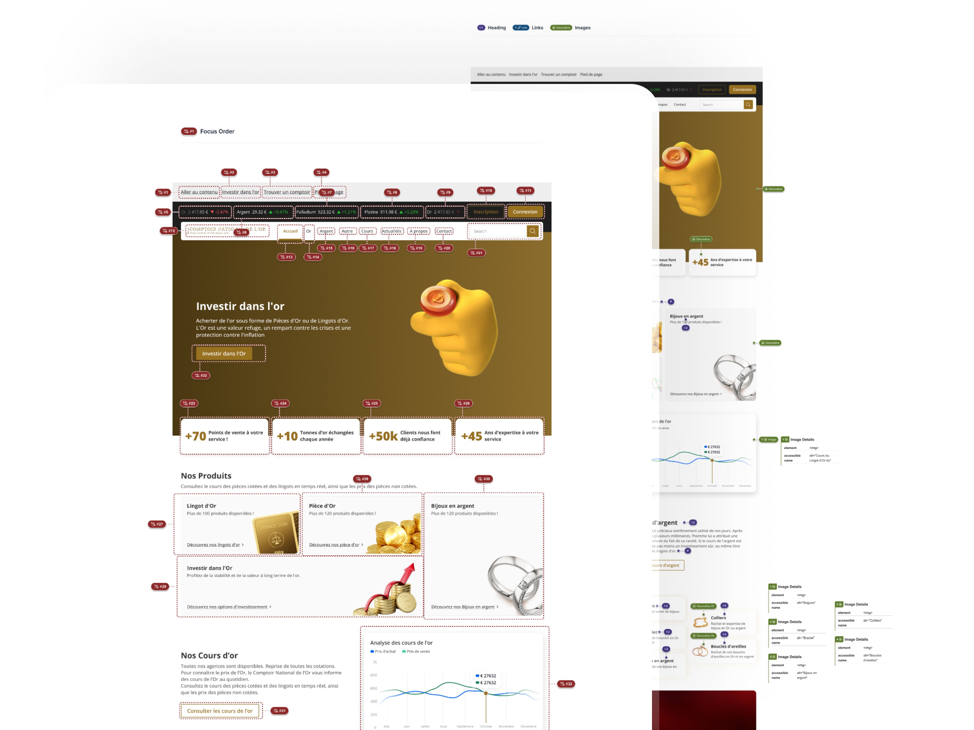 Accessibility audit: We began by conducting a comprehensive accessibility audit of the Gold.fr website. This audit evaluated the site's compliance with WCAG standards and identified areas for improvement using Colour Contrast Analyser, HeadingsMap, Fonts Ninja